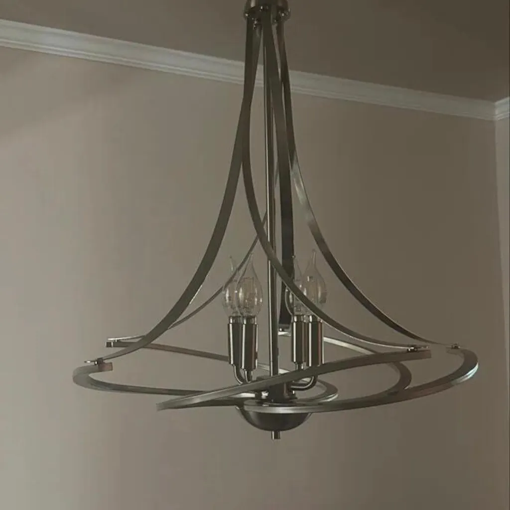 Introducing the Marlow 4-Light Chandelier, a stunning lighting fixture that adds a touch of glamour to your interior space. The fixture features classical candle-style lights and an elegant design inspired by twirling ribbons, creating a graceful and sophisticated aesthetic. With a brushed nickel finish, this chandelier is easy to integrate into your existing decor. Perfect above a dining room table or in the living room. Elevate the look and feel of your home with the Marlow 4-Light Chandelier.